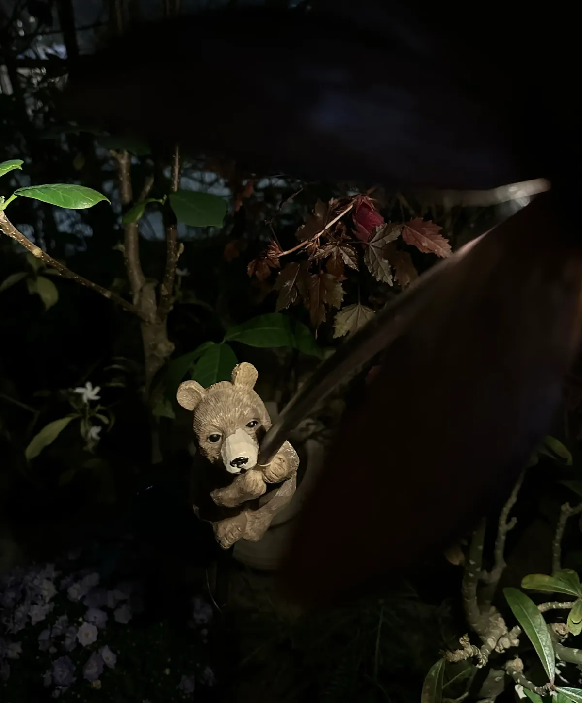 this little sun-charged guardian bear will be watching over my garden every night from now on i only need to lift my head to see him glowing there in the dark.